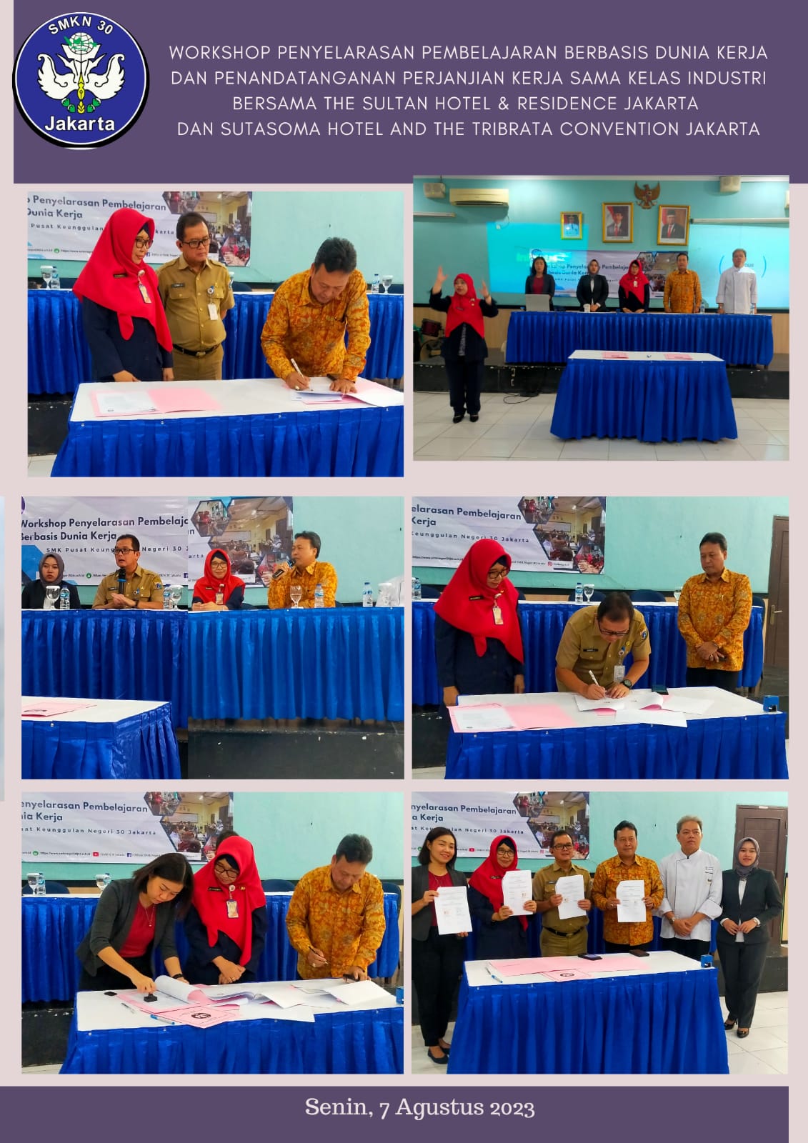 WORKSHOP PENYELARASAN PEMBELAJARAN BERBASIS DUNIA KERJA DAN PENANDATANGANAN PERJANJIAN KERJA SAMA KELAS INDUSTRI BERSAMA THE SULTAN HOTEL AND RESIDENCE JAKARTA DAN SUTASOMA HOTEL AND THE TRIBRATA CONVENTION JAKARTA