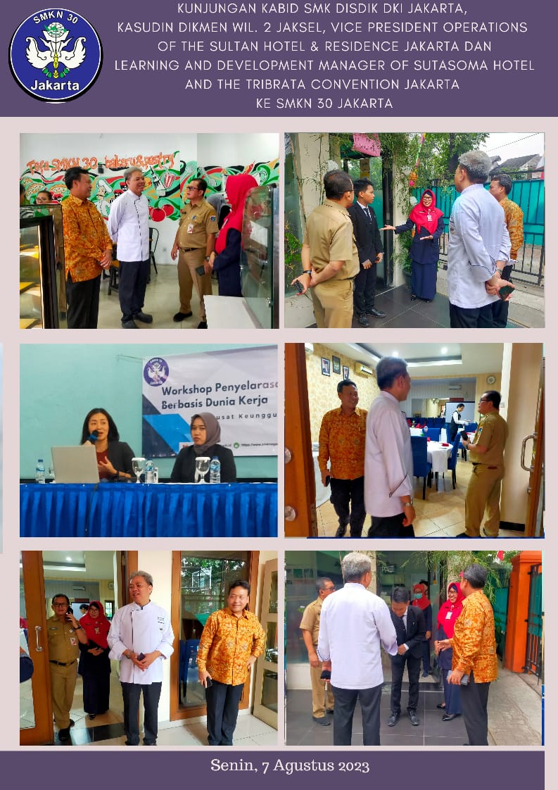 KUNJUNGAN KABID SMK DISDIK DKI JAKARTA, KASUDIN DIKMEN WIL. 2 JAKSEL, VICE PRESIDENT OPERATIONS OF THE SULTAN HOTEL & RESIDENCE JAKARTA DAN LEARNING AND DEVELOP MENT MANAGER OF SUTASOMA HOTEL AND THE TRIBRATA CONVENTION JAKARTA KE SMKN 30 JAKARTA