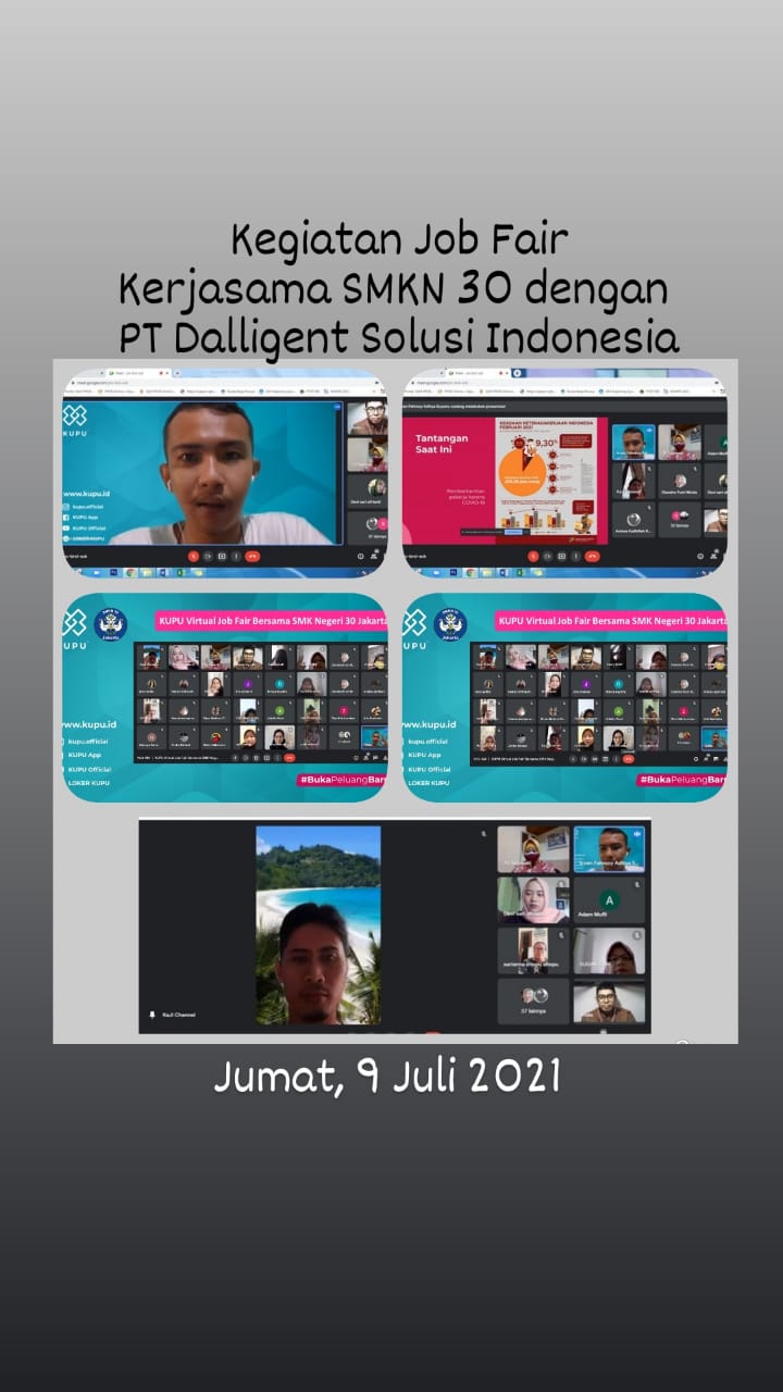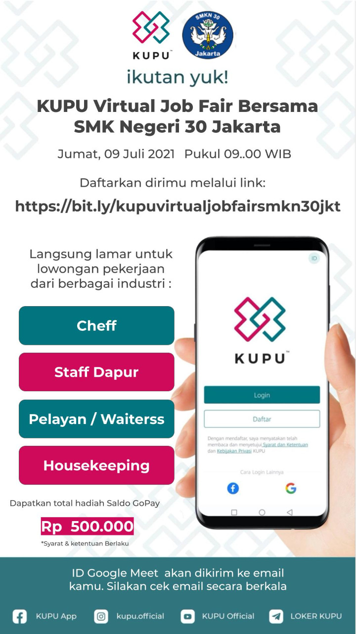 SMK Negeri 30 Jakarta bekerja sama dengan KUPU Virtual Job Fair mengadakan Kegiatan Job Fair yang berlangsung secara Daring, Kegiatan tersebut akan dilaksanakan pada Jum'at, 09 Juli 2021 Pukul 09.00.