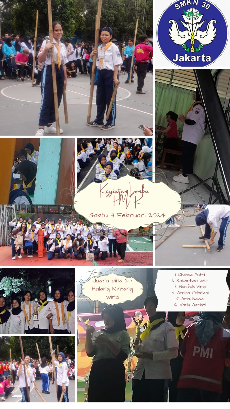 Kabar membanggakan datang dari ekstrakurikuler Palang Merah Remaja (PMR) SMKN 30 Jakarta. Tim kebanggaan kita berhasil membawa pulang trofi Juara Bina 2 dalam kategori Halang Rintang pada perlombaan yang diselenggarakan di SMA 70 Jakarta baru-baru ini.